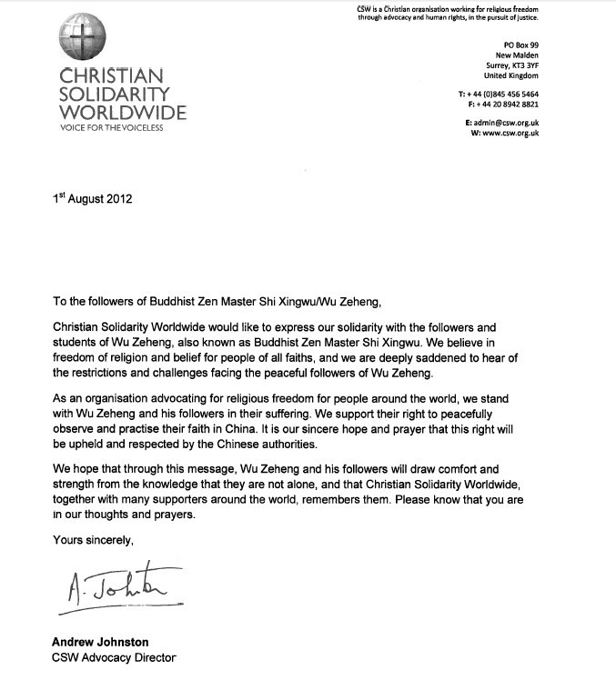 Christian Solidary Worldwide would like to express our solidarity with the followers and students of Wu Zeheng, also known as Buddhist Zen Master Shi Xingwu. We believe in freedom of religion and belief for people of all faiths, and we are deeply saddened to hear of te restrictions and challenges facing the peacful followers of Wu Zeheng.