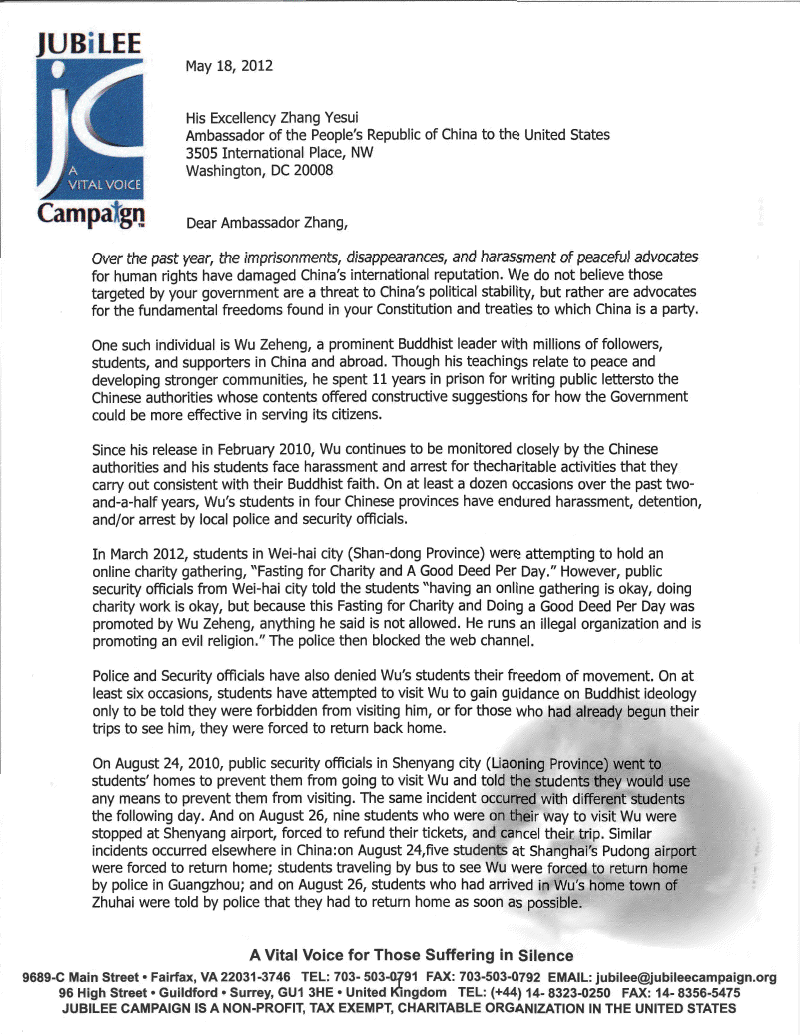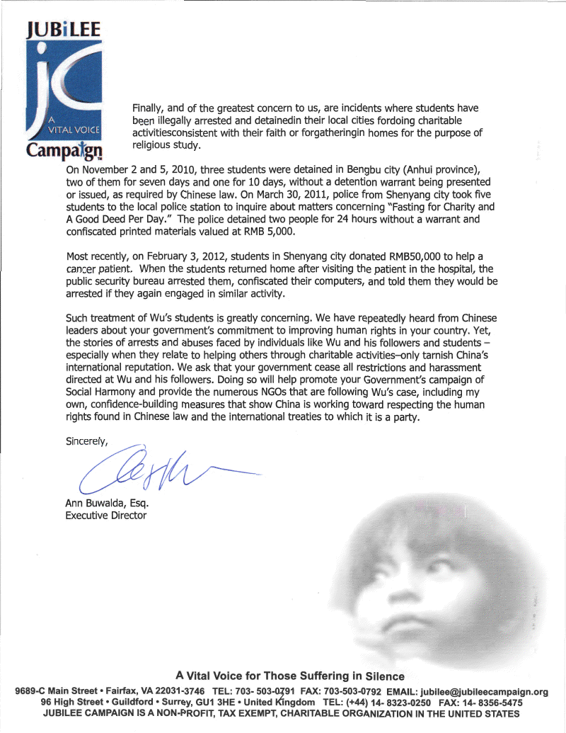 May 18, 2012, Jubilee Campaign USA sent a letter to Chinese Ambassador in Washington DC, to urge Chinese officials to cease all restictions and harassment toward Wu's followers, especially when they are doing charity work.