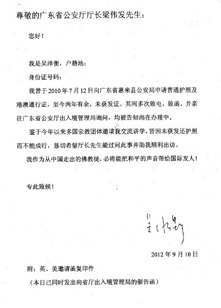 On September 10, 2012, Wu sumbitted summons letters to the Public Security Bureau of Jieyang City & Guangdong Province, and a letter to the Minister of the Guangdong Public Security Bureau, regarding the immediate issuance of his passport. The documentation for this is below.